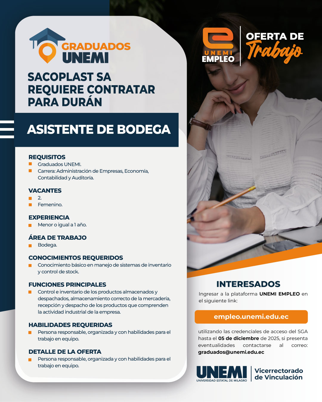 Ingresar a la plataforma UNEMI-EMPLEO en el siguiente link: https://empleo.unemi.edu.ec/ utilizando las credenciales de acceso del SGA hasta el 05 de diciembre del 2025, si presenta eventualidades contactarse al correo: graduados@unemi.edu.ec.