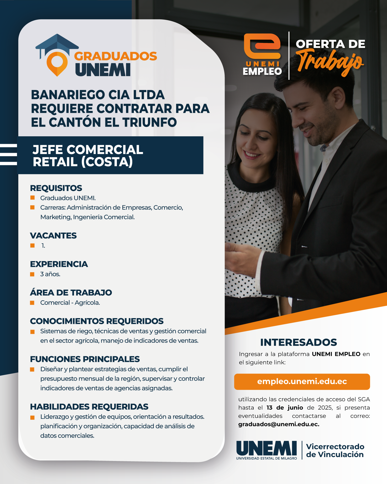 Ingresar a la plataforma UNEMI-EMPLEO en el siguiente link: https://empleo.unemi.edu.ec/ utilizando las credenciales de acceso del SGA hasta el 13 de junio del 2025, si presenta eventualidades contactarse al correo: graduados@unemi.edu.ec.