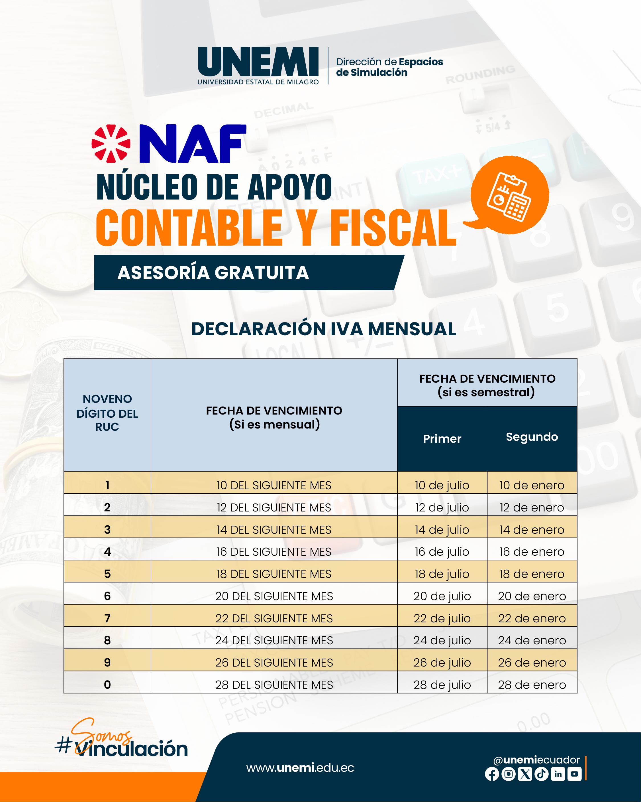 La Universidad Estatal de Milagro, a través del Núcleo de Apoyo Contable y Fiscal (NAF), informa a la comunidad universitaria docentes, personal administrativo y estudiantes sobre los trámites tributarios vigentes y próximos a vencer, con el fin de prevenir retrasos y fomentar el cumplimiento oportuno de las obligaciones fiscales.